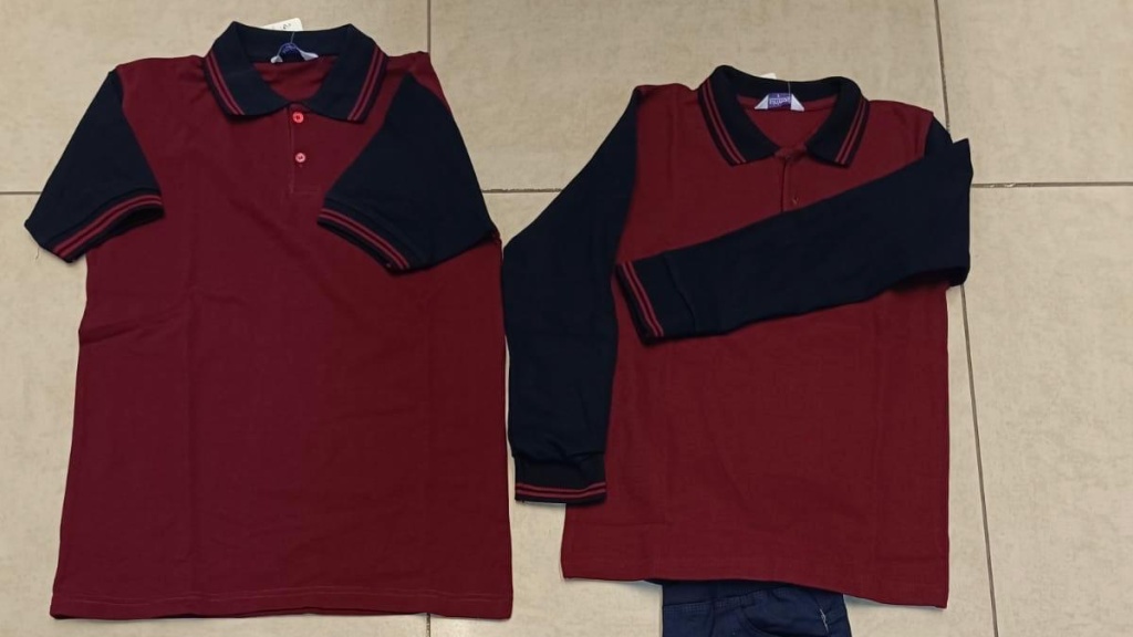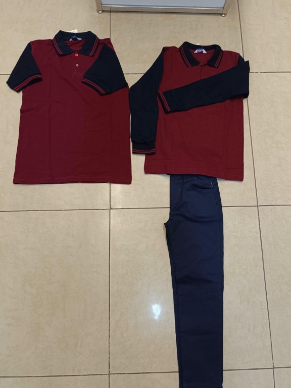 Thsirt: %100 pamuk penye lacos kumaş zemin renk bordo kollu-kolsuz kol ve yaka lacivert, kollarında ve iki bilek kısmında iki bordo çizgi , iki düğmeli , düğme tarafı bordo.